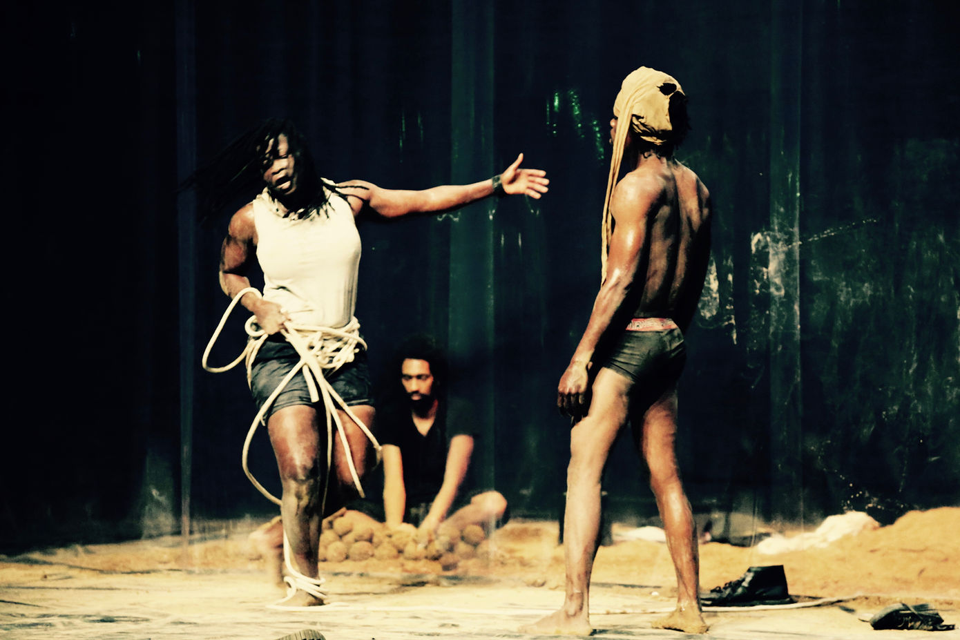 Né parmi les « Sujets à vif » du Festival d’Avignon, comme un corps-à-corps entre Nadia Beugré et le compositeur et guitariste Seb Martel, la pièce se développe avec Adonis Nebié qui rejoint l’équipe. Le tapis rouge du titre, celui des stars, n’est que l’incarnation moderne d’une longue tradition : celle de tracer une piste sacrée, isolée de la terre, qui permettait déjà au clergé antique d’éviter tout contact symbolique avec le bas monde. Tapis rouge va au contraire chercher du côté de ce que l’on cache sous ce tissu. Marquée par sa rencontre, au Burkina Faso, avec des femmes et des enfants qui se saignaient dans les mines, Nadia Beugré parle, à travers sa danse, de la brutalité exercée à l’égard de groupes souvent invisibles.